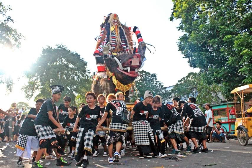 Tak lama kami berdiri di depan Ruby Supermarket dan memotret beberapa moment karena perut sudah tak sabar ketemu jodohnya. Aku sudah terbayang-bayang lezatnya ayam goreng khas Cafe Kebalen dan Tempe peyet yang sambelnya pas banget. Kamipun beranjak meninggalkan raksasa-raksasa yang tak tahu kapan akan selesai berparade itu. Hari semakin sore tapi di kejauhan masih saja terdengat riuh renah musik dan hiruk pikuk suara orang-orang di Carnival Ogoh-ogoh, semoga yang muslim tidak lupa sholat Ashar kana keasikan menyaksikan monster-monster itu.